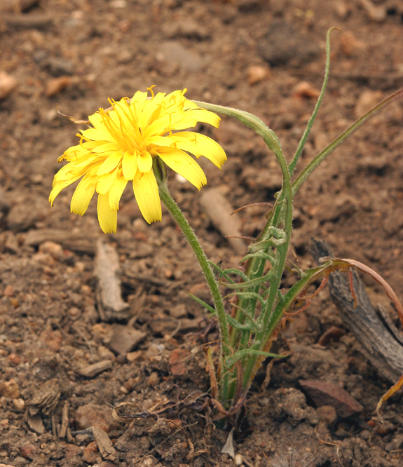 Agoseris parviflora is a North American species of flowering plants in the daisy family known by the common name Steppe agoseris or sagebrush agoseris or false dandelion. It is found in the Western United states primarily in the Great Basin and the region drained by the Colorado River but also in the eastern foothills of the Sierra Nevada and on the western edge of the Great Plains. Its range extends from eastern Oregon and eastern California to Wyoming, Colorado, and New Mexico, with a few isolated populations in western Kansas and western South Dakota. Agoseris parviflora resembles the common dandelion (Taraxacum officinale) in having no leafy stems, only a rosette of leaves close to the ground. There is a single flowerhead with many yellow ray florets but no disc florets. Agoseris parviflora resembles the common dandelion (Taraxacum officinale) in having no leafy stems, only a rosette of leaves close to the ground. There is a single flowerhead with many yellow ray florets but no disc florets.