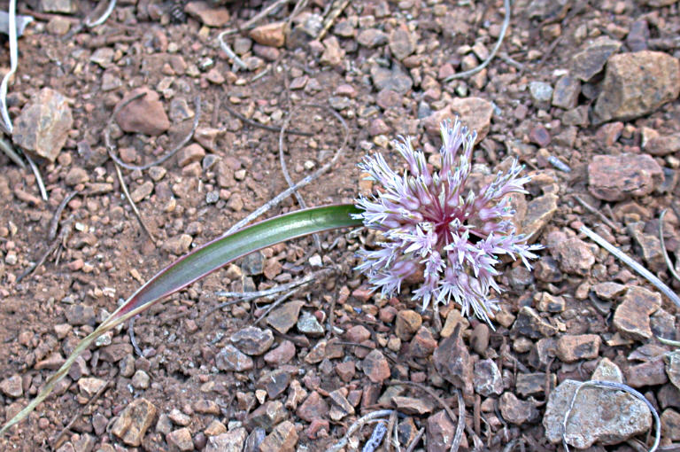 Allium hoffmanii is a species of wild onion known by the common name beegum onion. It is endemic to northern California, where it grows in the serpentine soils of the local mountain ranges. This onion grows a short stem up to about 10 centimeters tall from a brown or reddish bulb one or two centimeters long. There is generally a single leaf which may be longer than the stem. The flower cluster is packed with up to 40 flowers, each about a centimeter long and pink or purple in color with greenish veining. The protruding stamens are bumpy at their bases and have purple anthers at the tips.