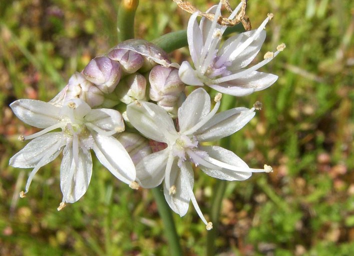 Allium howellii is a species of wild onion known by the common name Howell's onion. It is endemic to California, where it grows in the granite and serpentine soils of several of the local mountain ranges, hills, and valleys. This is a tall onion plant, producing a stem which may exceed half a meter in height from a reddish-brown bulb one to two centimeters long. There is a single cylindrical leaf about as long as the stem. The flower cluster holds up to 100 dark-veined lavender to white flowers, each under a centimeter long.