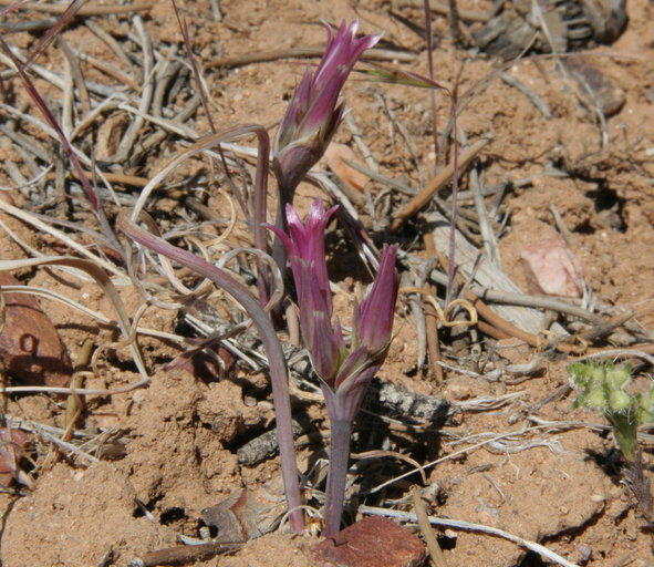 Allium parishii is an uncommon species of wild onion known by the common name Parish's onion. It is native to the Mojave Desert and Sonoran Deserts of California (San Bernardino, Riverside, and San Diego Counties) and Arizona (Yuma and Mohave Counties). It grows on open dry, rocky slopes at elevations of 900-1400 m. Allium parishii grows from a reddish brown bulb just over a centimeter long and produces a scape up to about 25 centimeters tall. There is a single cylindrical leaf which is generally longer than the stem. The umbel contains up to 25 dark-veined pale pink flowers with narrow tepals between one and two centimeters long. Anthers and pollen are yellow.