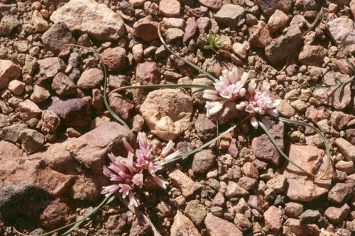 Allium parvum is a species of wild onion known by the common name small onion. It is native to the western United States where it is a common member of the flora in rocky, dry areas, especially in talus. This onion has a bulb one to two and a half centimeters wide and bears a relatively short stem for an onion species, reaching a maximum of 12 centimeters tall. The two leaves are sickle-shaped. Atop the stem is an flower cluster of fewer than 30 flowers, which are generally pale pink with prominent dark midveins. This plant was a food and flavoring for the Paiute people.