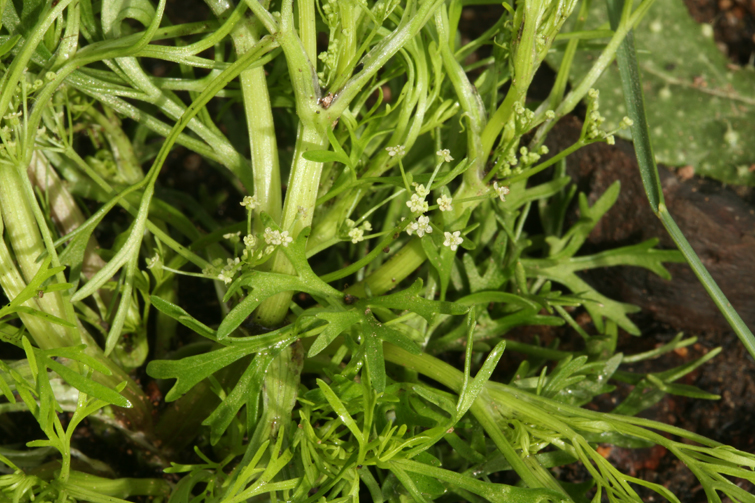 Apiastrum is a monotypic genus of flowering plant in the Apiaceae, containing the single species Apiastrum angustifolium, which is known by the common name mock parsley. It is native to California and Baja California, where it is resident in many types of habitat. This is an annual herb producing a branching stem up to half a meter tall from a taproot. Leaves are plentiful along the stem, each up to about 5 centimeters long and split into many narrow lobes. Several inflorescences arise from the stem, often but not always from leaf axils. The inflorescence is a compound umbel of tiny flowers each with five pointed white petals.
