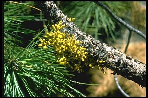 Arceuthobium campylopodum is a species of dwarf mistletoe known as western dwarf mistletoe. It is native to the low to moderate elevation coniferous forests of western North America. It is a common parasite of several species of pine tree, including Jeffrey Pine, Ponderosa Pine, and Coulter Pine. The dwarf mistletoe is a greenish-yellow structure above the bark of the tree, while most of the plant is beneath the bark. Seeds mature during the fall and disperse to nearby trees. Test 1