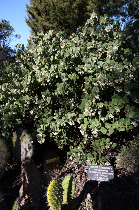 Arctostaphylos confertiflora is a rare species of manzanita known by the common name Santa Rosa Island Manzanita. This shrub is endemic to California, where it grows on the sandstone bluffs of Santa Rosa Island in the Channel Islands. This manzanita is listed as an endangered species by the United States Government. There are a few individuals in two locations on the island, and most of them are threatened by cattle, elk, and deer, which eat them. This is a small, twisting manzanita with blood red to gray bark and glandular bristles on its branches. The leaves are light, dull green, glandular and hairy or bristly. The small flowers are rounded and milky white, less often pale pink, and bunched densely in inflorescences. The fruits are fuzzy drupes around a centimeter in diameter.