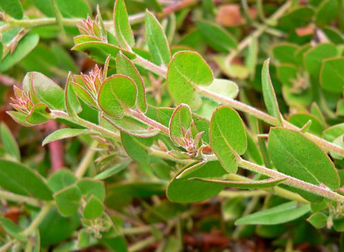 Arctostaphylos cruzensis is a species of Heath (Ericaceae) known by the common names La Cruz manzanita and Arroyo de la Cruz manzanita. This shrub is endemic to California, where it grows in the sand of the coastline in Monterey and San Luis Obispo Counties. It is considered rare due to its limited distribution. This region experiences summer fog that is an important part of its water budget. This is a very petite manzanita which grows flat on the ground or shaped into a low mound. The stem is covered in red shreddy bark. The small, pointed oval leaves are bright green and sometimes slightly toothed or with a fringe of hairs along the reddish edges. The flowers are very pale pink and urn-shaped with tapered throats. The fruits are hairy drupes up to a centimeter in diameter and containing angular seeds.