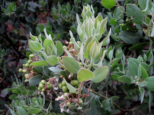 Otay Manzanita (Arctostaphylos otayensis) is a beautiful rare native shrub that grows in San Diego county in the the Otay Mountains of San Diego County, possibly extending into northern Baja. It is rare in the northern part of the Peninsular Range. Leaves are striking - light pink when new, and gray- green when mature. Flowers are white and bloom early and long. It tends to grow in stony slopes and volcanic rock outcrops, at elevations from 1000-4000 feet.