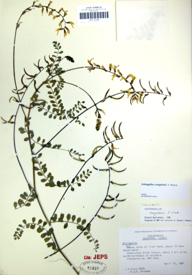Astragalus congdonii is a species of milkvetch known by the common name Congdon's milkvetch. Astragalus congdonii is a hairy perennial herb growing to heights between 20 and 70 centimeters. The sparse leaves are up to 14 centimeters long and are made up of several pairs of oval-shaped leaflets. The large, open inflorescence bears up to 35 cream-colored flowers, each about 1 to 1. 5 centimeters long. The fruit is a narrow legume pod up to 3. 5 centimeters long which dries to a thick papery texture. Astragalus congdonii is endemic to the Sierra Nevada foothills of central California.