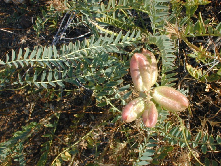 Astragalus pomonensis is a species of milkvetch known by the common name Pomona milkvetch. It is native to Baja California and southern California, where it can be found in a number of coastal habitats, including the California Coast Ranges. This is a bushy perennial herb forming a clump of thick, hollow stems up to about 80 centimeters tall. Leaves are up to 20 centimeters long and are made up of many oval-shaped leaflets each up to 3 centimeters in length. The flower cluster is a large array of up to 45 cream-colored flowers. Each flower is between one and two centimeters long. The fruit is a bladdery legume pod which dries to a thin, almost transparent papery texture. It may exceed 4 centimeters in length and generally drops off the plant when dry.