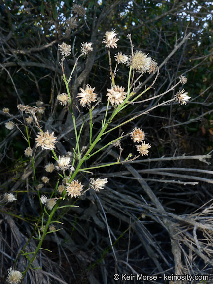 Baccharis vanessae is a rare California species of baccharis known by the common name Encinitas baccharis. It is native primarily to San Diego County, California, almost endemic to the county except for one population a few miles over the county line in Riverside County. It is a member of the chaparral flora. It is a federally listed threatened species. It is present in several sites in Encinitas, and it is known from other parts of the county from the coastline to the mountains on various substrates. There are perhaps 15 populations remaining, for a total of about 2000 individuals. Some of the remaining occurrences are on land which may be cleared for development. Baccharis vanessae is a sticky, glandular shrub producing dense, branching, erect stems approaching 2 meters in maximum height. The leaves are linear and up to 4. 5 centimetres (1. 8 in) long. This dioecious shrub produces male and female flower heads on different individuals. The fruit is an achene with a pappus up to a centimeter long. Fire suppression in the fire-prone chaparral habitat threaten those plants occurring near residential areas. Introduced species of plants have altered the local plant community. Some of the populations are very small, made up of just a few individuals, reducing their genetic viability.