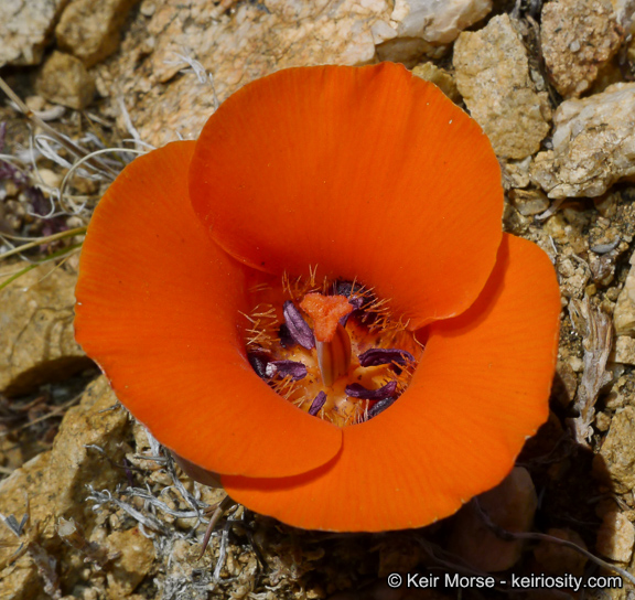 Calochortus kennedyi is a species of flowering plant in the lily family known by the common name desert mariposa lily. It is native to the deserts of the southwestern United States and northwestern Mexico. It is a perennial herb which produces a slender, unbranching, sometimes twisting stem up to 50 centimeters tall, but generally shorter. There is a basal leaf 10 to 20 centimeters long which is waxy in texture and withers at flowering. The flower cluster bears 1 to 6 erect bell-shaped flowers in a loose cluster. Each flower has three sepals and three petals which are usually spotted at the bases. The petals may be 5 centimeters long and are yellow, orange, or red in color. The fruit is an angled, striped capsule up to 6 centimeters in length.