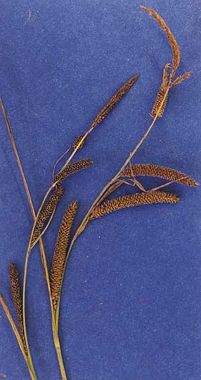 Carex angustata is a species of sedge known by the common name widefruit sedge. It is native to the western United States from Washington and Idaho to California, where it grows in wet meadows and on streambanks. This sedge grows from a large rhizome network and does not form clumps as many other sedges do. The stems reach up to about a meter in maximum height with narrow, rough leaves. The flower cluster produces a few pistillate spikes and one or two staminate spikes, each a few centimeters long. The pistillate flowers have dark colored leafs. The fruit is covered in a sac called a perigynium which is 2 or 3 millimeters long, veined and bumpy, and generally green or pale brown in color, sometimes with red or purple spotting.