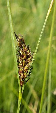 Carex lasiocarpa is a species of sedge known by the common names slender sedge and woollyfruit sedge. This is an aquatic or shore plant of wet areas in mountainous areas of moderate elevation. It is found across much of North America and Eurasia. It is colonial, forming thick, floating mats on the water in wetlands and monotypic stands on shorelines and lakesides. From a rhizome it bears erect stems which may exceed a meter in height and very long, very thin leaves. The stem has one to several compact pistillate spikes and at the tip one longer, fluffy staminate spike. The pistillate spike vaguely resembles a tiny purplish or brownish ear of corn, with several ovaries which each form a fruit.