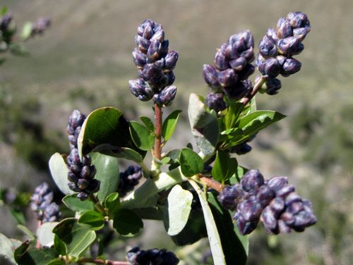 This large shrub has thorns that grow along the stem. Its blue-green leaves are small and oval and contrast nicely with the gray-white, waxy stem. Chaparral whitehorn blooms in spring, with long clusters of tiny flowers in shades of blue, lavender, or white. The small fruit is a sticky, yellow-green capsule small mammals, birds, and insects eat. Mule deer and bighorn sheep browse the new growth and shoots.