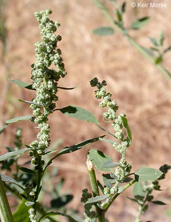 Chenopodium berlandieri, also known by the common names pitseed goosefoot, huauzontle, and lamb's quarters, is an annual herbaceous plant in the goosefoot family. The species is widespread in North America, where it is native to Alaska and northern Canada south to Michoacân, Mexico, and including every U. S. state except Hawaii. The fast-growing, upright plant can reach heights of more than 3 m. It can be differentiated from most of the other members of its large genus by its honeycomb-pitted seeds, and further separated by its serrated, more or less evenly lobed lower leaves.
