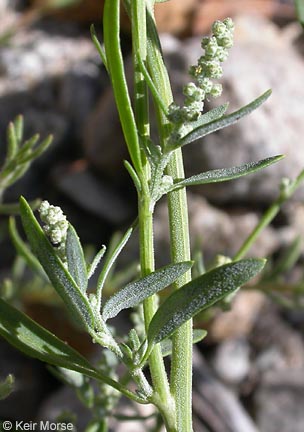Chenopodium desiccatum is a species of flowering plant in the goosefoot family known by the common names aridland goosefoot and slimleaf goosefoot. It is native to parts of western North America, including sections of the Western United States and southern Western Canada. It grows naturally in open land such as prairie and dunes, chaparral, adapts well to disturbed areas such as roadsides, and in montane habitats such as in the Transverse Ranges and Sierra Nevada of California. Chenopodium desiccatum is an annual herb producing an erect, branching stem up to about 35 centimeters in maximum height. It is powdery in texture, especially on the leaves and flowers. The fleshy leaves are less than 3 centimeters long and generally oval in shape with a smooth edge. The inflorescence is an array of tightly-packed clusters of tiny flowers. Each dusty flower has a five-lobed corolla which encloses the developing fruit.