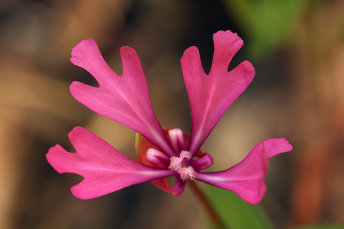 Clarkia concinna is a species of wildflower in the Onagraceae (Evening Primrose) family known as Red Ribbons. It is endemic to California, where it can be found in the northern Coast Ranges from Santa Clara County to Humboldt County, and in the Sierra foothills. This is an annual plant with erect, herbaceous stems. The distinctive flowers have four looping sepals of red or dark pink which look like loops of silk ribbon. The longer, pink petals have three lobes which are usually streaked with white.