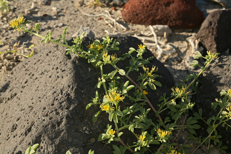 Cleomella obtusifolia is a species of flowering plant in the cleome family known by the common name Mojave stinkweed. It is native to the Mojave Desert and adjacent hills, where it grows in alkaline soils in the desert scrub. It is an annual herb producing a rough, hairy stem up to 90 centimeters long. The branching stem grows erect when new and then the branches droop to the ground with age, forming a bushy clump or mat. Each leaf is made up of three fleshy oval leaflets. Flowers appear in dense racemes on older stems and solitary in leaf axils on new stems. Each flower has generally four hairy green sepals and four yellow petals grouped together on one side of the involucre. The whiskery yellow stamens protrude up to 1. 5 centimeters from the flower. The fruit is a hairy, valved capsule a few millimeters in length. It hangs at the tip of the remaining flower receptacle.