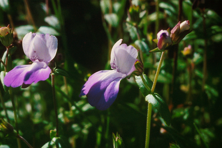 Collinsia multicolor is a species of flowering plant in the plantain family, known by the common names San Francisco blue-eyed Mary and San Francisco collinsia. It is endemic to the San Francisco Bay Area, where it is known from San Francisco to Santa Cruz. As of 2008 there are 22 known occurrences. Populations south of Santa Cruz have been extirpated. The plant grows in coniferous forests and shady, moist habitats of the coastal chaparral scrub. Collinsia multicolor is an annual herb producing a delicate, slender stem 30 to 60 centimeters tall. The upper parts of the stem are hairy and sticky with glands. The oppositely arranged leaves are triangular lance-shaped with serrated edges, each pair clasping the stem where they meet. The inflorescence is a series of whorls or clusters of flowers, the lower series bearing one or two flowers and the upper bearing several in a whorl. Each flower arises on a pedicel. The corolla is between one and two centimeters long and has two white upper lobes sometimes dotted with purple and three lavender to purple lower lobes. This plant was first described by the English architect Joseph Paxton in association with John Lindley.