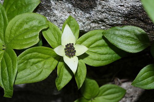 Cornus canadensis (Canadian Dwarf Cornel, Canadian Bunchberry, Crackerberry) is a herbaceous member of the Cornaceae (Dogwood) family. It is widespread outside of California, but within the state it is a rare species occurring only near the coast in Mendocino County. It grows about 20-30 centimeters tall and bears tiny flowers a few millimeters across that form a cluster at the center of four white, petal-like leaves 3-4 centimeter diameter. Each flower has highly elastic petals that flip backward, releasing springy filaments that are cocked underneath the petals. The filaments snap upward flinging pollen out of containers hinged to the filaments. This motion takes place in less than half a millisecond and the pollen experiences 800 times the force that the space shuttle does during liftoff. The Bunchberry has one of the fastest plant actions found so far requiring a camera capable of shooting 10,000 frames per second to catch the action (Edwards et al. 2005).