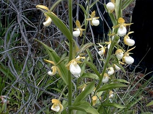 The California Lady's Slipper (Cypripedium californicum) is a member of the orchid genus Cypripedium, the Lady's Slipper orchids. It is native to the western United States, where it has a very restricted range and can only be found in the mountains of southwestern Oregon (Kalmiopsis Wilderness), and northern California. It prefers the margins of woodland streams in ous forests. It often grows in very large clumps and each stem can bear up to 21 flowers. It can grow to be up to over a meter in height and has alternate, plicate leaves the length of the stem. The petals and sepals tend to be greenish-brown while the small pouch is pure white with occasional pink spots.