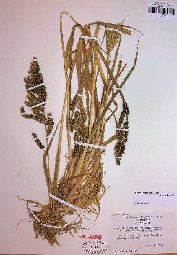 Echinochloa muricata is a species of grass known by the common names rough barnyard grass and American barnyard grass. It is native to Eurasia and much of North America. It is an annual grass growing one half to one meter in height.