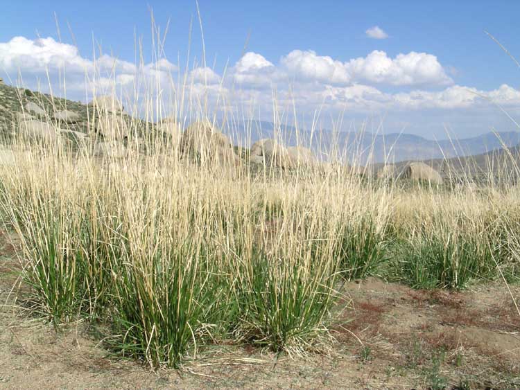 Leymus cinereus is a species of wild rye known by the common names basin wild rye and giant wild rye. It is a common native grass of western North America, including western Canada and the United States from California to South Dakota and Minnesota. It grows in many types of habitat, including grassland and prairie, forests, scrub, chaparral, and sagebrush. This is a perennial grass forming large, tough clumps up to 2 meters tall and sometimes exceeding one meter in diameter. It has a large, fibrous root system and sometimes small rhizomes. The flower cluster is an unbranched, cylindrical spike divided into up to 35 nodes with several flower spikelets per node.