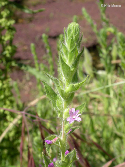 Epilobium densiflorum is a species of willowherb known by the common names denseflower willowherb, dense spike-primrose or dense boisduvalia. It is native to western North America from British Columbia to Baja California, where it is found in a variety of habitats. This is an erect annual often exceeding a meter in height with fuzzy green foliage. The pointed leaves are up to 8 centimeters long near the base of the plant, and the upper leaves are generally more hairy than the lower. The stem may branch or not. The top of the stem is occupied by a hairy, leafy, densely flowered inflorescence. Each flower has four deeply notched petals in shades of pinkish purple to nearly white with dark veining, each about a centimeter long. The fruit is a cylindrical capsule about a centimeter long.