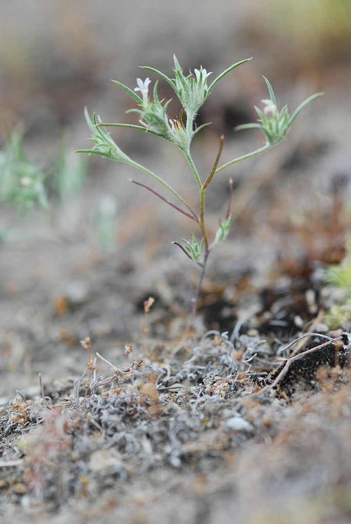 Eriastrum hooveri is a rare species of flowering plant in the phlox family known by the common name Hoover's woollystar. It is endemic to the South Coast Ranges of California from San Benito to Los Angeles Counties, where it grows in grassy open habitat. It is an annual herb producing a wiry, usually woolly stem up to about 15 centimeters tall. The leaves are linear and threadlike, less than three centimeters long, and sometimes divided into two thready lobes. The inflorescence is a woolly cluster of narrow, leaflike bracts laced with webby fibers. The flowers are white and just a few millimeters in length. This plant was considered to be in serious jeopardy in the 1980s when many of its populations, most of which occurred on private and unprotected land, were in immediate danger of being destroyed by one or more threats, including conversion of the land for agricultural use, petroleum drilling, development for housing, grazing, agricultural pollution, invasive plants, flooding, and fire suppression. The plant was federally listed as a threatened species in 1990. After the listing, further studies revealed many more populations, including several in counties where it was not previously known. The species may have been sparse during the 1980s surveys due to drought conditions. The plant was also found to be more adaptable and resilient to destruction than previously thought. Several companies that own land where the plant occurs, such as that in the Lost Hills Oil Field, have put protection measures in place. Based on these events, which demonstrated the plant was not as threatened as was feared, it was delisted in 2003. It is still designated a sensitive species by the Bureau of Land Management.