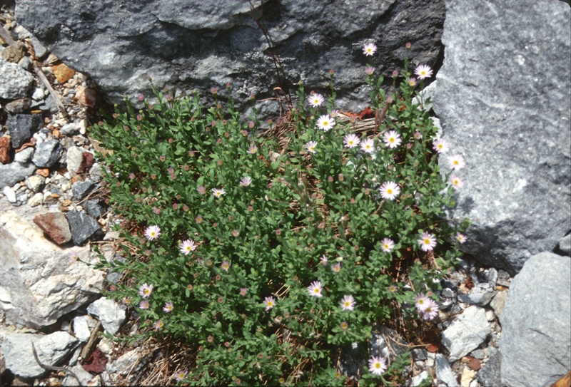Erigeron aequifolius is a rare species of flowering plant in the aster family known by the common names Hall's daisy and Hall's fleabane. It is endemic to California, where it is known from fewer than 20 locations in the southern High Sierra Nevada of Mariposa, Fresno, Kern, and Tulare Counties. It grows in woodlands and coniferous forests. Erigeron aequifolius is a small perennial herb growing a hairy, glandular stem up to about 20 centimeters (8 inches) tall from a woody caudex and taproot. The small leaves are equal in size and evenly spaced along the stem. The inflorescence is a usually solitary flower head at the tip of the stem. The head contains many yellow disc florets surrounded by a fringe of ray florets which are white when new and turn blue as they dry. The fruit is a tiny achene with a pappus of bristles.