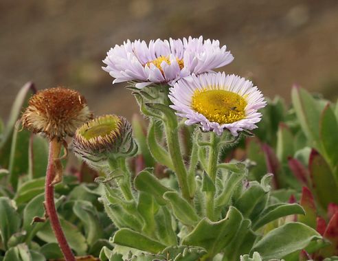As its common name implies, Seaside Daisy (Erigeron glaucus) is a perennial plant in the Daisy family that grows on the coastline of California and also north into coastal Oregon. This cheerful plant has a long flowering season, which can be prolonged by deadheading spent flowers. It blooms profusely in shades of lavender and pink, with large yellow centers. The flowers are attractive to butterflies and bees.