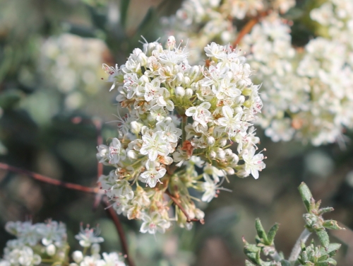 California Buckwheat has several recognized varieties that are found in different ecoregions. This variety (var. polifolium) is a smaller and grayer buckwheat, commonly found in the Sonora and Mojave deserts, although its ranges covers the southern California foothills as well. It grows in southern and central California, as well as outside of the state, on dry slopes and washes and canyons, at elevations from 200-7500 feet. It is both more heat tolerant and more cold tolerant.