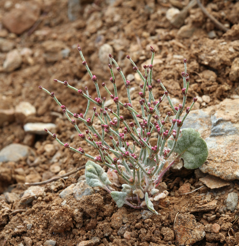 Eriogonum palmerianum is a species of wild buckwheat known by the common name Palmer's buckwheat. It is native to the southwestern United States and Great Basin region, where it grows in many types of desert and sagebrush plateau habitat. This is an annual herb producing an erect stem up to 30 centimeters tall which is coated in woolly fibers. The leaves are located around the base of the stem and are borne on short petioles. This is an annual herb producing an erect stem up to 30 centimeters tall which is coated in woolly fibers. The leaves are located around the base of the stem and are borne on short petioles. The upper part of the stem spreads into an inflorescence lined with clusters of small white, yellow, or pink flowers.