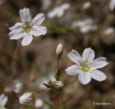 Eriogonum spergulinum is a species of wild buckwheat known by the common name spurry buckwheat. There are three varieties: two are limited and endemic to the Sierra Nevada in California; while the more common of the three, var. reddingianum, the Redding buckwheat, can be found from California to Idaho. This buckwheat is an annual herb varying in form from prostrate to erect, 40 centimeters long including inflorescence. The plant is mostly naked, with sparse linear leaves around the base of the stem and at points along the stem. The flowering stem is slender and branching, bearing clusters of small white flowers with dark midribs.