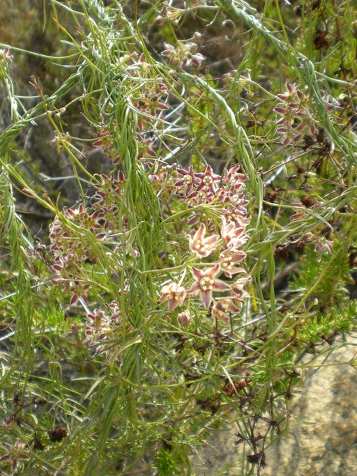 Funastrum cynanchoides (formerly called Sarcostemma cynanchoides), fringed twinevine or climbing milkweed, is a perennial plant in the Dogbane Family (Apocynaceae) that grows twining through other plants in the Mojave Desert and Colorado Desert. It has milky sap and smells pungent. It is similar to Funastrum hirtellum. Its narrow, arrowhead shaped leaves are opposite and 1" to 1 1/2" long. Flowers. Flowers are pink to purplish, and are produced in umbrella-like heads (umbels. Fruits. It has a fruit that is 3" to 4" long, with tufted seeds about 1. 4" long.