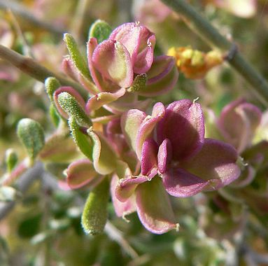 Grayia is a monotypic genus of plants containing the sole species Grayia spinosa, which is known by the common names hop sage and spiny hop sage. This plant is widely distributed across the western United States, where it grows in a number of desert and mountain habitats. It is a small, multibranched, brambly shrub generally under a meter in height. The grayish branches have spiny, pointed ends and stiff twigs. During the growing season the branches are covered in small oval-shaped, flat to scooplike leaves mostly under 3 centimeters in length. The shrub is dioecious, with male individuals flowering in clumps of a few flowers surrounded by leaflike leafs, and female individuals producing flower clusters of bright pink, yellow, or white fruiting leafs surrounding tiny petalless pistillate flowers. Female flower clusters are much larger than male and make the plant one of the more colorful shrubs in the springtime habitat. The fruit is a utricle only a few millimeters wide. The shrub sheds its leaves and flowers by the summer in hot or dry areas and becomes a woody gray thicket; it is evergreen in some regions. The genus was named after the botanist Asa Gray.