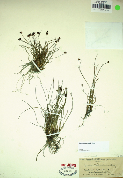 Juncus duranii is an uncommon species of rush known by the common name Duran's rush. It is endemic to southern California, where it is known only from the San Gabriel, San Bernardino, and San Jacinto Mountains. The plant grows in wet habitat in the local forests.