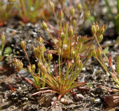 Juncus luciensis is a species of rush known by the common name Santa Lucia dwarf rush. It is endemic to California, where it is uncommon. This species is an annual herb growing just a few centimeters tall. It is yellowish green in color. The leaves are up to 1. 5 centimeters long. The inflorescence contains one or two flowers with yellow-green tepals. The fruit is a greenish or sometimes red-tinged capsule containing seeds which are no more than 0. 4 millimeters long.