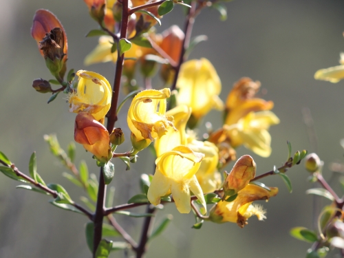 Keckiella antirrhinoides (formerly Penstemon antirrhinoides) is a species of flowering shrub in the plantain family known by the common names snapdragon penstemon and chaparral beardtongue. It is native to the chaparral, deserts, and pinyon-juniper woodlands of California, Arizona, and adjacent Baja California. This shrub grows one half to two and a half meters tall, with spreading branches. The oppositely-arranged leaves are up to 2 centimeters long and are lance-shaped or narrow ovals. They are deciduous during dry periods. The plant produces branchlike flower clusters which bear snapdragon-like flowers. Each hairy flower is about 2 centimeters wide, with three lower lobes which lie flat or curve down and two upper lobes which join to form a curved lip. Inside the flower are shiny filamentous stamens holding anthers and a flat, densely hairy sterile stamen called a staminode. The flowers are light yellow and dry to nearly black. The plant will often drop many leaves after flowering.