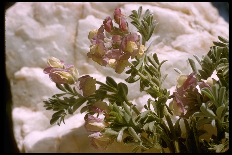 Lathyrus littoralis is a species of wild pea known by the common name silky beach pea. It is native to the coastline of western North America from British Columbia to California. It is a resident of beaches and dunes. This is a perennial herb which grows a patch of hairy gray-green stems along the sandy ground or slightly upright. The woolly leaves are made up of several oval or oblong scoop-shaped leaflets. There are small, tough tendrils but the plant does not use them to climb. The plant produces dense inflorescences of several flowers each one to two centimeters wide. Each flower is bicolored in dark-veined deep pink and white. The fruit is a dehiscent oval-shaped hairy legume pod.