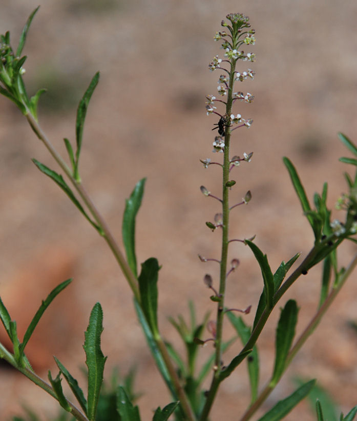 Lepidium virginicum, also known as least pepperwort, Virginia pepperweed or peppergrass, is an annual or biennial plant in the Brassicaceae or mustard family. It is native to much of North America, including most of the United States and Mexico and southern regions of Canada, as well as most of Central America. It can be found elsewhere as an introduced species. As with Lepidium campestre, Virginia pepperweed's most identifiable characteristic is its raceme, which comes from the plant's highly branched stem. The racemes give Virginia pepperweed the appearance of a bottlebrush. On the racemes are first small white flowers, and later greenish fruits. The entire plant is generally between 10 and 50 centimeters tall. The leaves on the stems of Virginia pepperweed are sessile, linear to lanceolate and get larger as they approach the base. Note that all parts of the plant have a peppery taste. Cultivation and uses. Virginia pepperweed grows as a weed in most crops and is found in roadsides, landscapes and waste areas. It prefers sunny locales with dry soil. The plant is edible. The young leaves can be used as a potherb, sauted or used raw, such as in salads. The young seedpods can be used as a substitute for black pepper. The leaves contain protein, vitamin A and vitamin C.