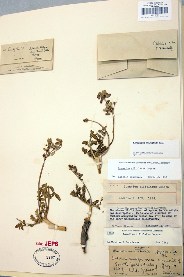 Lomatium ciliolatum is a species of flowering plant in the carrot family known by the common name Yolla Bolly biscuitroot. It is endemic to California, where it is known from the mountain ranges adjacent to the north and south of the San Francisco Bay Area, at 300-600 feet, 1200-2100 m. It is often a member of the serpentine soils flora in woodland and chaparral habitat. Lomatium ciliolatum is a perennial herb growing 10 to 30 centimeters long from a taproot. It generally lacks a stem, producing hairy, clumpy or spreading leaves and inflorescences from ground level. The leaves are up to 7 centimeters long and divided into many highly divided leaflets with narrow lobes. The inflorescence is topped with an umbel of yellowish or purplish flowers. Lomatium ciliolatum is a perennial herb growing 10 to 30 centimeters long from a taproot. It generally lacks a stem, producing hairy, clumpy or spreading leaves and inflorescences from ground level. The leaves are up to 7 centimeters long and divided into many highly divided leaflets with narrow lobes. The inflorescence is topped with an umbel of yellowish or purplish flowers.