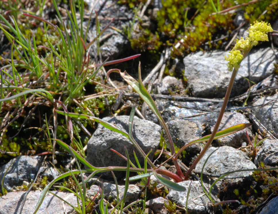Lomatium stebbinsii, known by the common name Stebbins' desertparsley, is a rare species of flowering plant in the carrot family. The plant is endemic to the central-western Sierra Nevada in California. It is known only from the slopes near the border of Calaveras and Tuolumne Counties, within the Stanislaus National Forest. It is a plant of chaparral and lower montane coniferous forest habitats. Lomatium stebbinsii is a perennial herb growing no more than about 15 centimetres (5. 9 in) tall from a rounded tuber. There is generally no stem, the leaves and inflorescence emerging at ground level. The sparse leaves are shiny green and hairless. Each has leaf blades divided into linear leaflets. The inflorescence is a small umbel of yellow flowers. ConservationThe California Native Plant Society lists the plant as a critically endangered species.