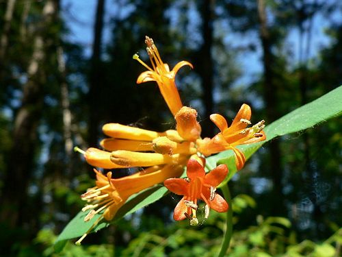 Lonicera ciliosa (Orange Honeysuckle or Western Trumpet Honeysuckle) is a honeysuckle native to forests of western North America. A deciduous shrub growing to 6 meter tall with hollow twigs, the leaves are opposite, oval, 4-10 centimeter long with the last pair on each twig merged to form a disk. The flowers are orange-yellow, 2-4 centimeter long, with five lobes and trumpet shaped; they are produced in whorls above the disk-leaf on the ends of shoots. The fruit is a translucent orange-red berry less than 1 centimeter diameter. The fruits are edible either raw or cooked, but are not a common food.