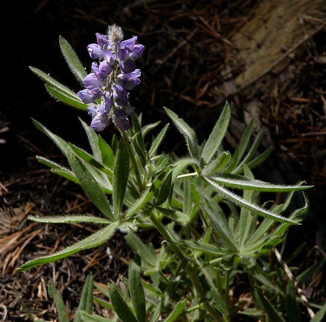 Lupinus adsurgens is a species of lupine known by the common name Drew's silky lupine. It is native to the Sierra Nevada and coastal mountain ranges of northern California and southern Oregon, where it grows in forest and other mountain habitat. It is a perennial herb growing 20-60 centimetres (7. 9-23. 6 in) in height. Each palmate leaf is made up of 6 to 9 leaflets each up to 5 centimetres (2. 0 in) long. The herbage is hairy and silvery or gray-green in color. The inflorescence is up to 23 centimetres (9. 1 in) long, bearing flowers just over a centimeter long. The flower is pale pink or purple to yellowish with a white or yellow patch on the banner. The fruit is a silky-haired legume pod 2 to 4 centimetres (1. 6 in) long containing 3 to 6 seeds.