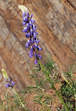Lupinus benthamii is a species of lupine known by the common name spider lupine. It is endemic to central California, where it is known from the Central Coast Ranges across the Central Valley into the Sierra Nevada foothills. It is common in some areas, covering hillsides with its blue blooms in the spring. This is a hairy annual herb growing 20 to 70 centimeters tall. Each palmate leaf is made up of 7 to 10 leaflets each up to 5 centimeters long. They are narrow and linear in shape, just a few millimeters wide. The flower cluster is an erect raceme of flowers up to 30 centimeters tall, the flowers sometimes arranged in whorls. The flower is between 1 and 2 centimeters long and bright to deep blue in color, generally with a white or pink spot on the banner, or upper petal. The fruit is a hairy legume pod about 3 centimeters long.