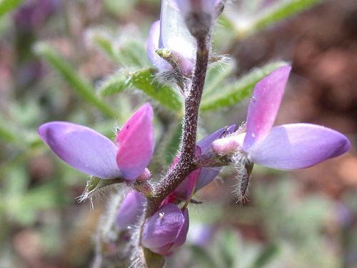 Lupinus concinnus is a species of lupine known by the common name Bajada lupine. It is native to the southwestern United States from California to Texas, and northern Mexico, where it is known from many types of habitat. This is a hairy erect or decumbent annual herb with a stem growing 10 to 30 centimeters long. Each small palmate leaf is made up of 5 to 9 leaflets up to 3 centimeters long and under a centimeter wide, sometimes narrow and linear in shape. The flower cluster is a dense spiral of flowers, with some flowers also appearing in leaf axils lower on the plant. Each flower is 5 to 12 millimeters long and purple, pink, or nearly white in color. The fruit is a hairy legume pod around a centimeter long.
