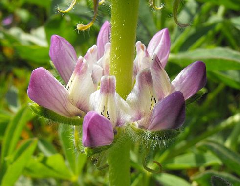 Lupinus excubitus is a species of lupine known as the grape soda lupine. Its common name refers to its sweet scent, which is said to be very reminiscent of grape soda. This species and its variants are found in the southwestern United States, especially in California, and in far northern Mexico. The plant is a small shrub with gray-green foliage. The fan-shaped leaves are each made up of 7 to 10 narrow leaflets. The raceme flower cluster is a tall stalk of rich purple flowers, each with a bright yellow spot. The occasional variant has white flowers. The fruit is a silky legume pod up to 5 centimeters in length containing mottled brown seeds.