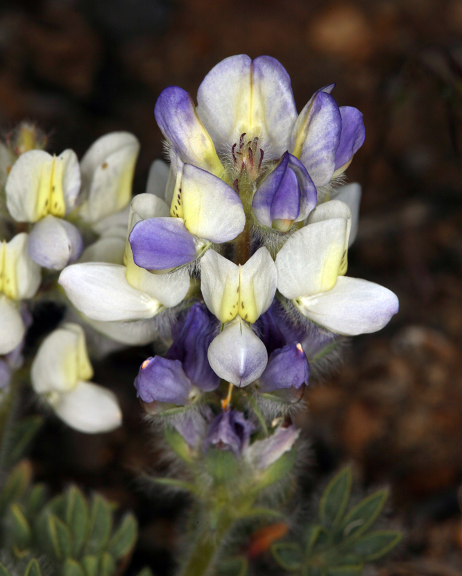 Lupinus pusillus (rusty lupine or dwarf lupine) is an annual plant in the legume family (fabaceae) found in the Colorado Plateau and Canyonlands region of the southwestern United States. :159Growth pattern. It is an annual plant growing up to 9 inches (23 cm) tall. "Pusillus is for the small size of the plant. :159Leaves and stems. Leaves are compound palmate with 3-9 1-2 to 1 1-2 inches (1. 3 to 3. 8 cm) long inversely lance- shaped leaflets. :159Plant stems and leaf stems (petioles) have long spreading hairs. :159Inflorescence and fruit. It blooms from April to June. :159Flowers are in stalks of 4-38 and bluish to purple or bicolored, with a yellow spot on the upper petal. :159Seedpods are nearly oval and have constrictions separating the seeds. :159Habitat and range. It can be found in desert shrubl and pinyon juniper woodland communities, from as far north as Washington, to California, and throughout the southwest. :159When growing in reddish sand, the blue flowers make a striking contrast with the sun at a low angle. :159Ecological and human interactions. It is pollinated by bees. :159