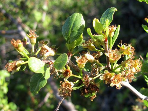 Lycium cooperi is a species of flowering plant in the nightshade family known by the common name peach thorn. It is native to the southwestern United States, where it grows in a variety of desert and mountain habitat types. This is a bushy, erect shrub approaching a maximum height of 4 meters with many rigid, thorny branches. The branches are lined thickly with fleshy oval or widely lance-shaped leaves each 1 to 3 centimeters long and coated with hairy hairs. The flower cluster is a small cluster of tubular flowers roughly 1 to 2 centimeters long including the calyx of fleshy sepals at the base. The flower is white or greenish with lavender or green veining. The corolla is a tube opening into a face with four or five lobes. The fruit is a yellow or orange berry under a centimeter wide containing many seeds.