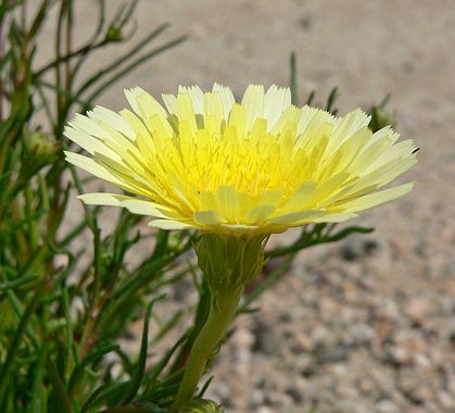 Malacothrix glabrata is a species of dicotyledonous flowering plant known generally as the smooth desert dandelion or desert dandelion. The species is native to the western United States, excluding much of the Pacific Northwest, and into northern Mexico. M. glabrata is typically 5 to 15 inches tall with a 1.5 to 2.5 inch flower head. Its fragrant, daisy-like flowers are in shades of yellow or white, and undeveloped flowers have a red "button" in the center of the flower head.